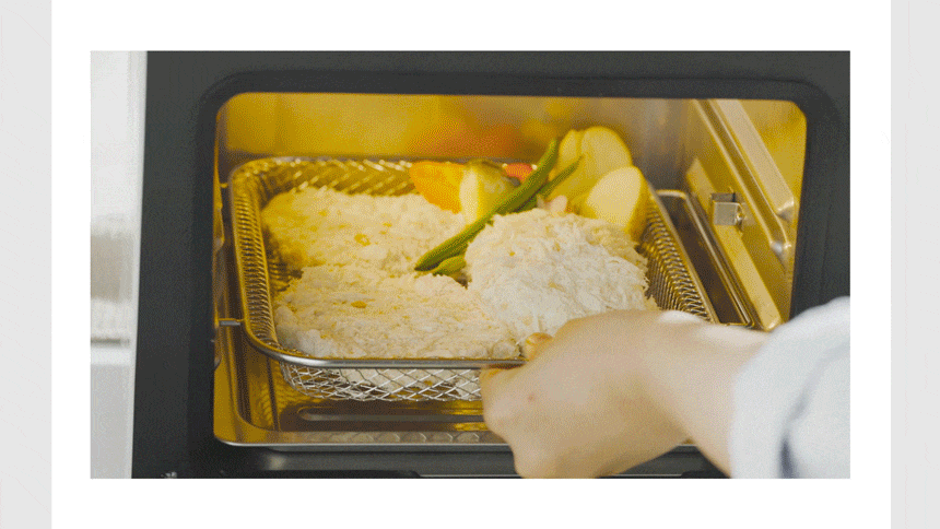 蒸烤模式(蒸煮及氣炸):基本設定值180℃/15分鐘,可調範圍120℃~220℃/1分鐘~60分鐘。